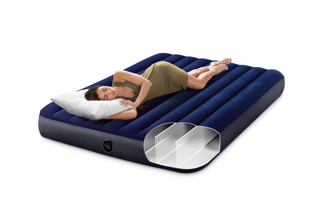 Intex Dura-Beam-teknikanvänder tusentals starka polyesterfibrer istället för traditionella PVC-balkar.Dura-Beam Standardsäkerställer att madrassen har enhögre fasthet och stabilitetän traditionella luftmadrasser. Detta minimerar "gungeffekten" och ökarvaraktighet, vilket ger en mycket bättresömnupplevelse.