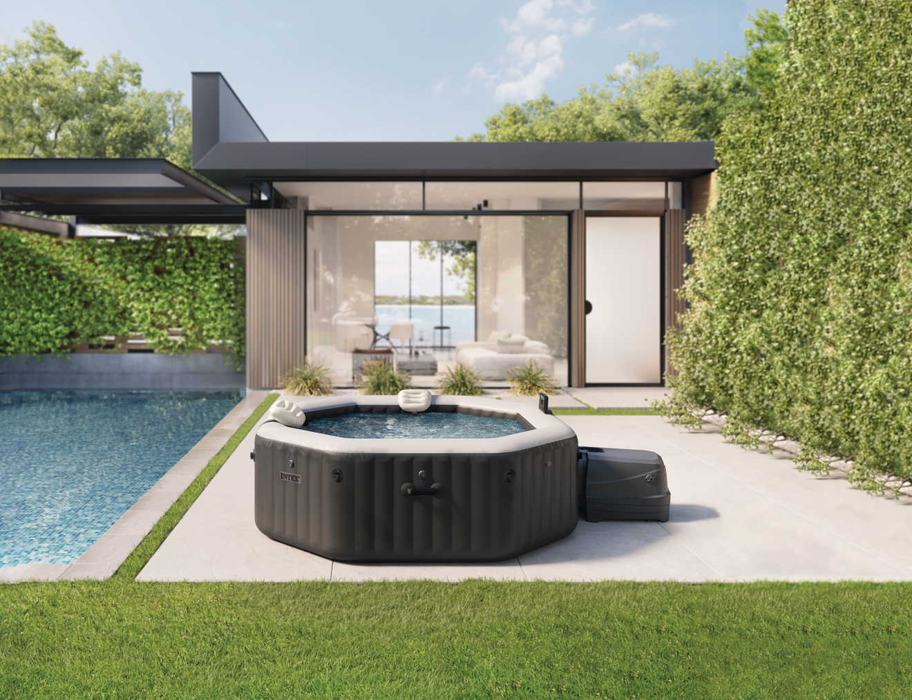 PureSpa™ Jet & Bubble Deluxe är guldstandarden bland lyxiga spa och kombinerar njutningen av högpresterande jetstrålar och lugnande bubbelmassage i en lyxig miljö. Det åttkantiga spaet i Onyx Black har upp till 140 lugnande bubbelstrålar och 6 kraftfulla massagestrålar (Hydro Jets) som arbetar i harmoni för din avkoppling. Spaet har också ett avancerat saltvattenrengöringssystem för enkelt underhåll.