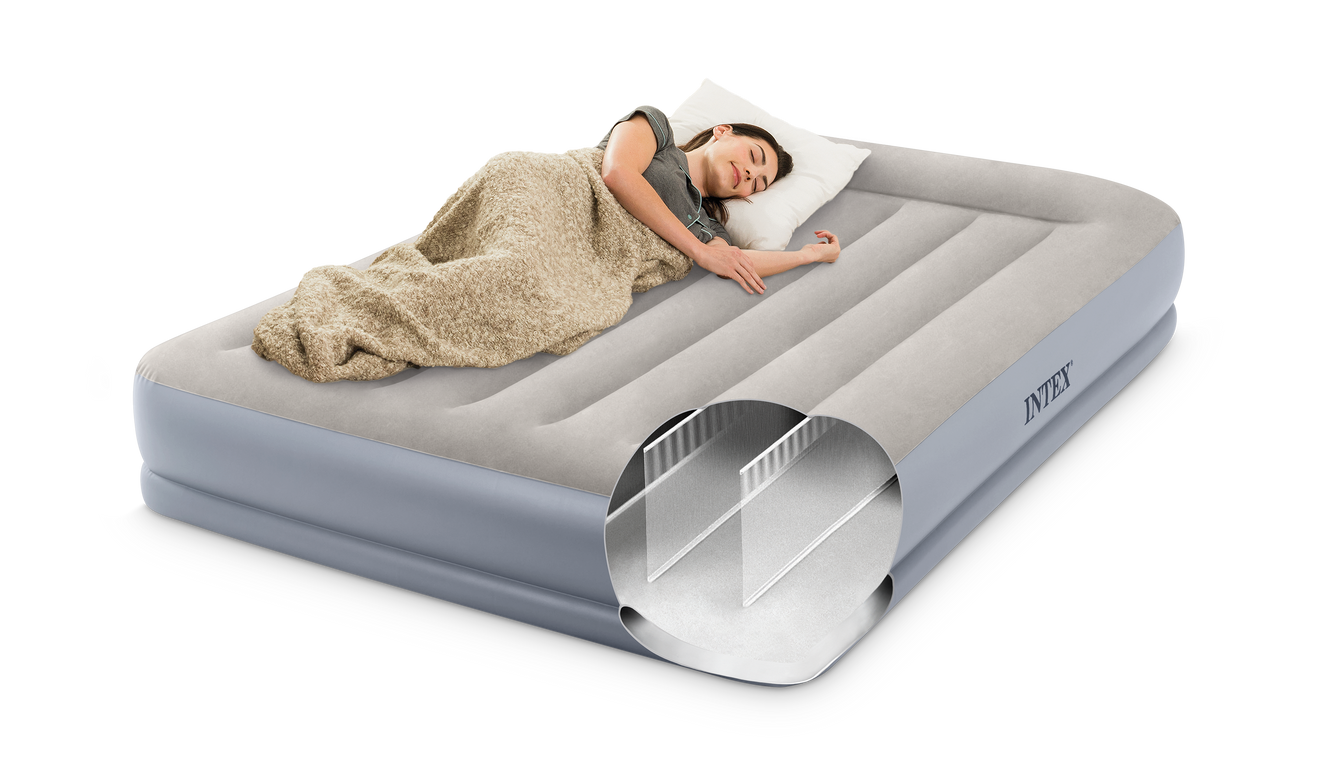 Intex Dura-Beam-teknikanvänder tusentals starka polyesterfibrer istället för traditionella PVC-balkar.Dura-Beam Standardsäkerställer att madrassen har enhögre fasthet och stabilitetän traditionella luftmadrasser. Detta minimerar "gungeffekten" och ökarvaraktighet, vilket ger en mycket bättresömnupplevelse.