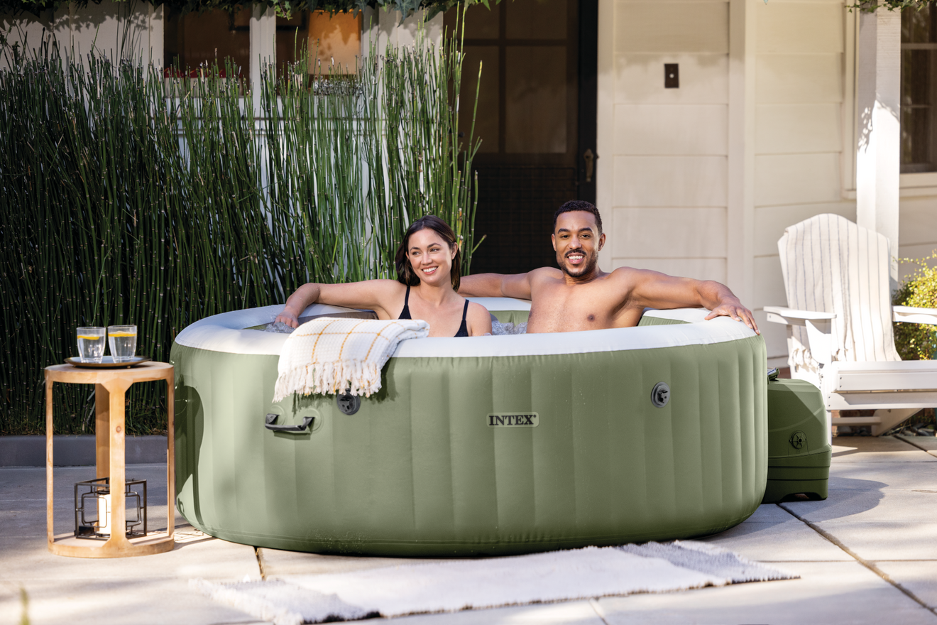 PureSpa™ Bubbelmassage är det perfekta sättet att varva ner efter en lång dag. Med 120 lugnande, uppvärmda bubbelbäddar får du en lugnande värme som garanterar komfort och avkoppling. Det runda spabadet har en elegant olivgrön färg och är byggt med Intex patenterade Fiber-Tech™-teknik, vilket garanterar överlägsen strukturell stabilitet och hållbarhet i många år framöver.