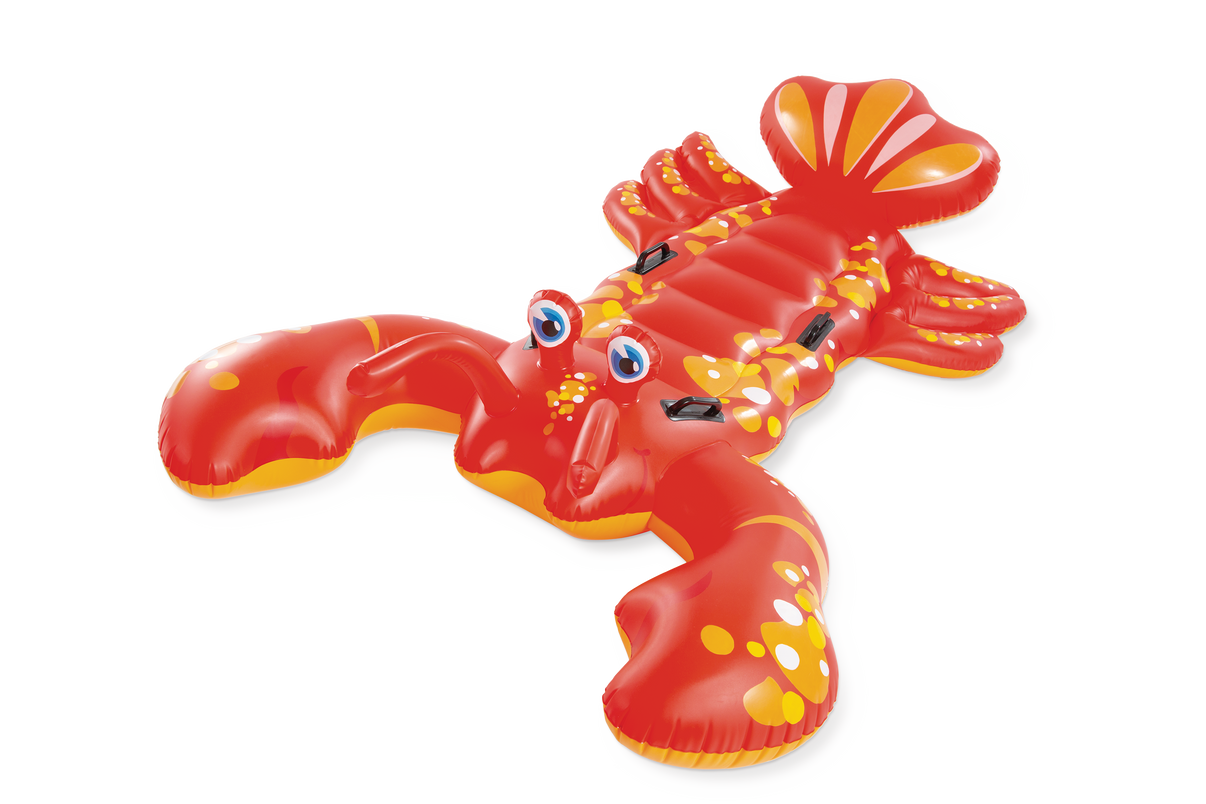 Intex Lobster är en rolig och färgglad uppblåsbar badleksak formad som en stor hummer. Den mäter 137 x 213 cm och är tillverkad i hållbar vinyl i röda och gula nyanser. komplett med två stora ögon som ger ett lekfullt uttryck. Luftmadrassen har tre luftkammare för extra säkerhet samt fyra handtag som säkerställer ett bra grepp och stabilitet i vattnet. Den är designad för att rymma två barn med en totalvikt på upp till 80 kg. Lämplig för barn från 3 år och uppåt. En reparationslapp ingår för små hål eller punkteringar.